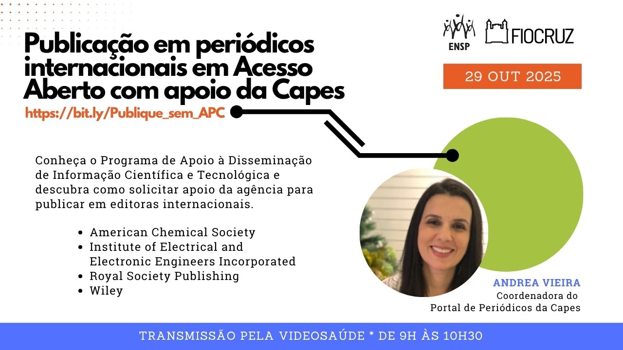 Na sequência da Semana Internacional do Acesso Aberto 2025, a Vice-Presidência de Educação, Informação e Comunicação (VPEIC) e o Núcleo de Ciência Aberta da Escola Nacional de Saúde Pública Sergio Arouca (Ensp/Fiocruz) promovem, no dia 29 de ...