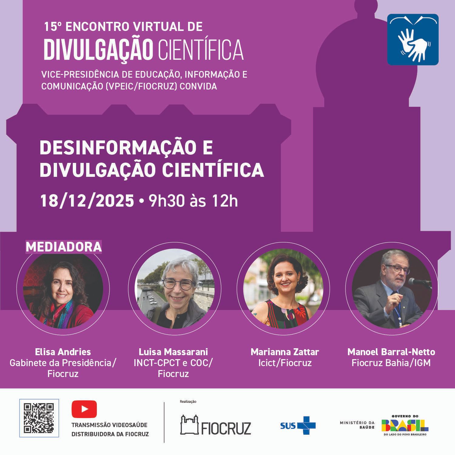 A Fiocruz realiza, no dia 18 de dezembro, das 9h30 às 12h, o 15º Encontro Virtual de Divulgação Científica, com o ...