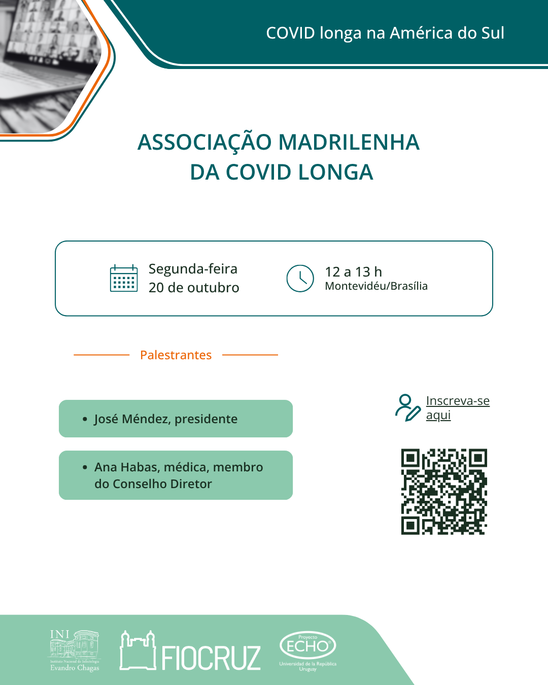 Nesta segunda-feira, 20 de outubro, das 12h às 13h, será realizado mais um webinar do Projeto Echo, com o tema: "Associação Madrilenha da Covid longa". A transmissão será feita pela plataforma Zoom e requer inscrição. Para participar, utilize o QR... Saiba mais