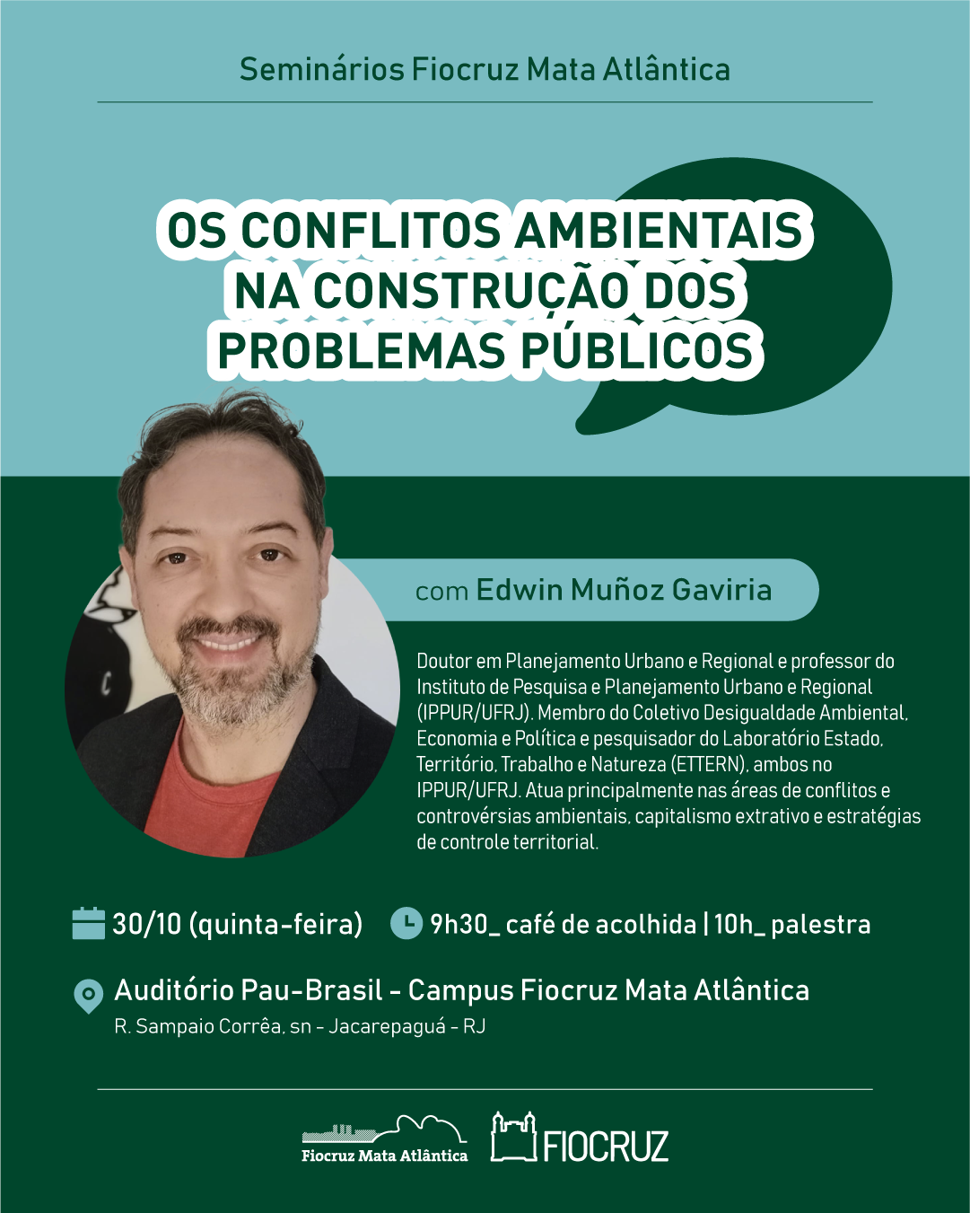 Na próxima quinta-feira, 30 de outubro, a partir das 9h30, será realizada mais uma edição dos Seminários Fiocruz Mata Atlântica. O tema da palestra será "Os conflitos ambientais na construção dos problemas públicos", com Edwin Muñoz Gaviria. O... Saiba mais