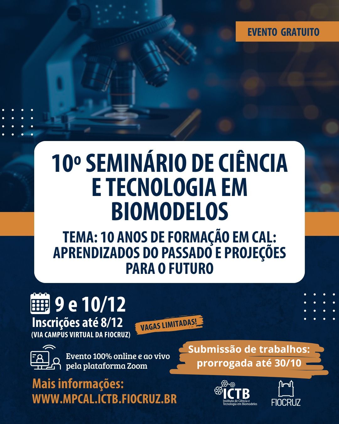 Foi prorrogado até quinta-feira, 30 de outubro, o prazo para submissão de trabalhos no 10º Seminário de Ciência e Tecnologia em Biomodelos. O evento, promovido pelo Mestrado Profissional em Ciência em Animais de Laboratório do Instituto de Ciência e... Saiba mais