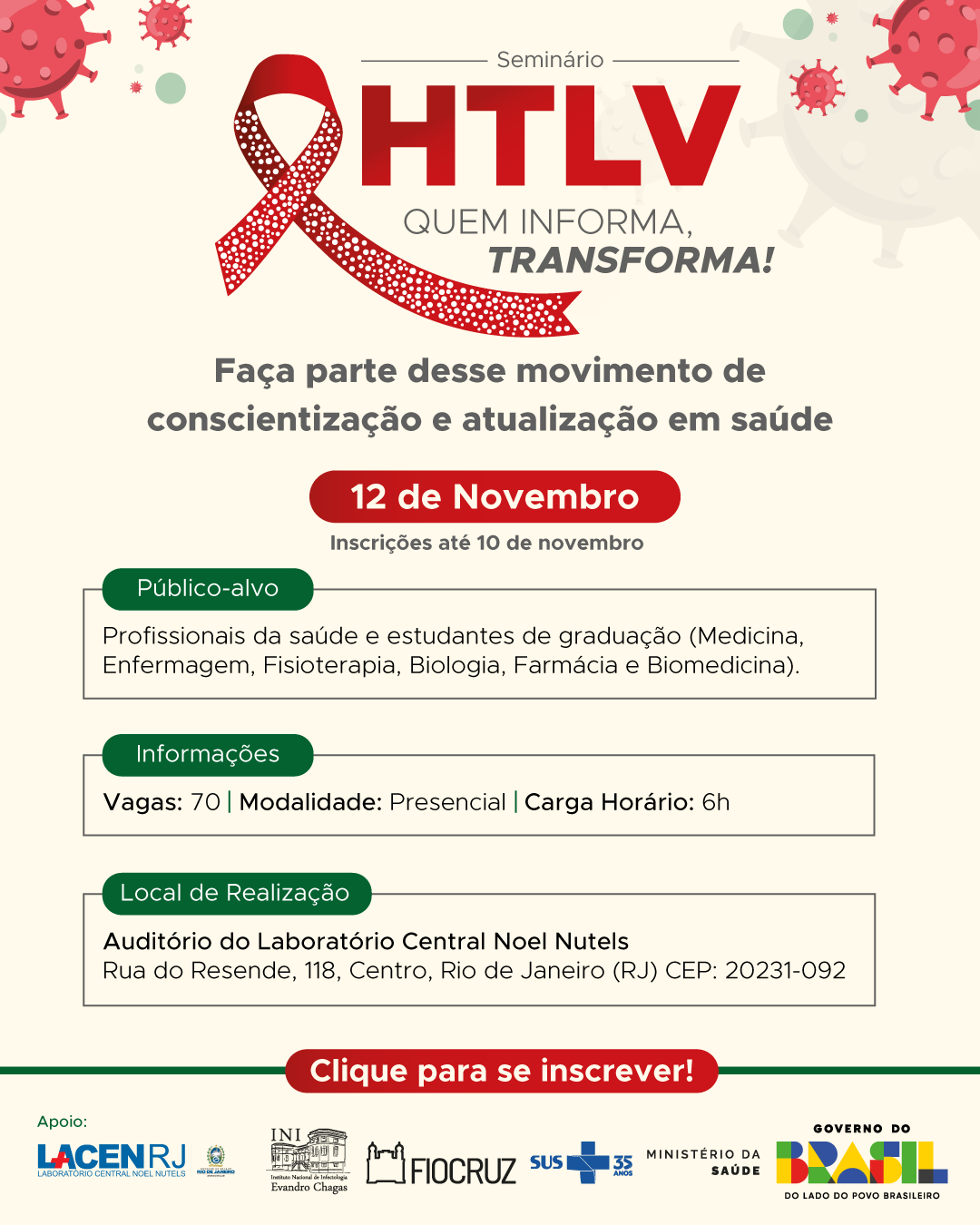 O Instituto Nacional de Infectologia Evandro Chagas (INI/Fiocruz), por meio do Laboratório de Pesquisa Clínica em Neuroinfecções (LaPClin Neuro), está com as inscrições abertas até o dia 12 de novembro para o Seminário HTLV: Quem informa, transforma... Saiba mais