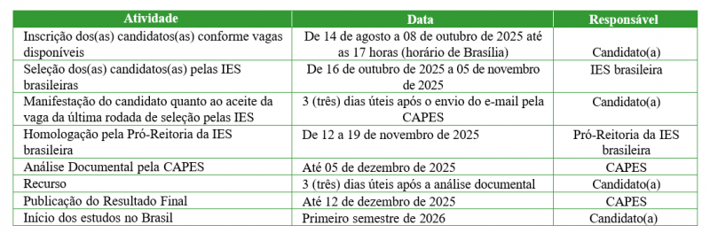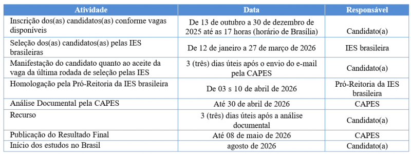 CAPES, through Public Call CAPES 12/2025-PEC-PG, aims to select up to 650 (six hundred and fifty) scholarship holders, from countries participating in the Program, who are not Brazilian nationals, to undertake the course in on-site Graduate Programs (PPG) at Brazilian Higher Education Institutions (HEIs).