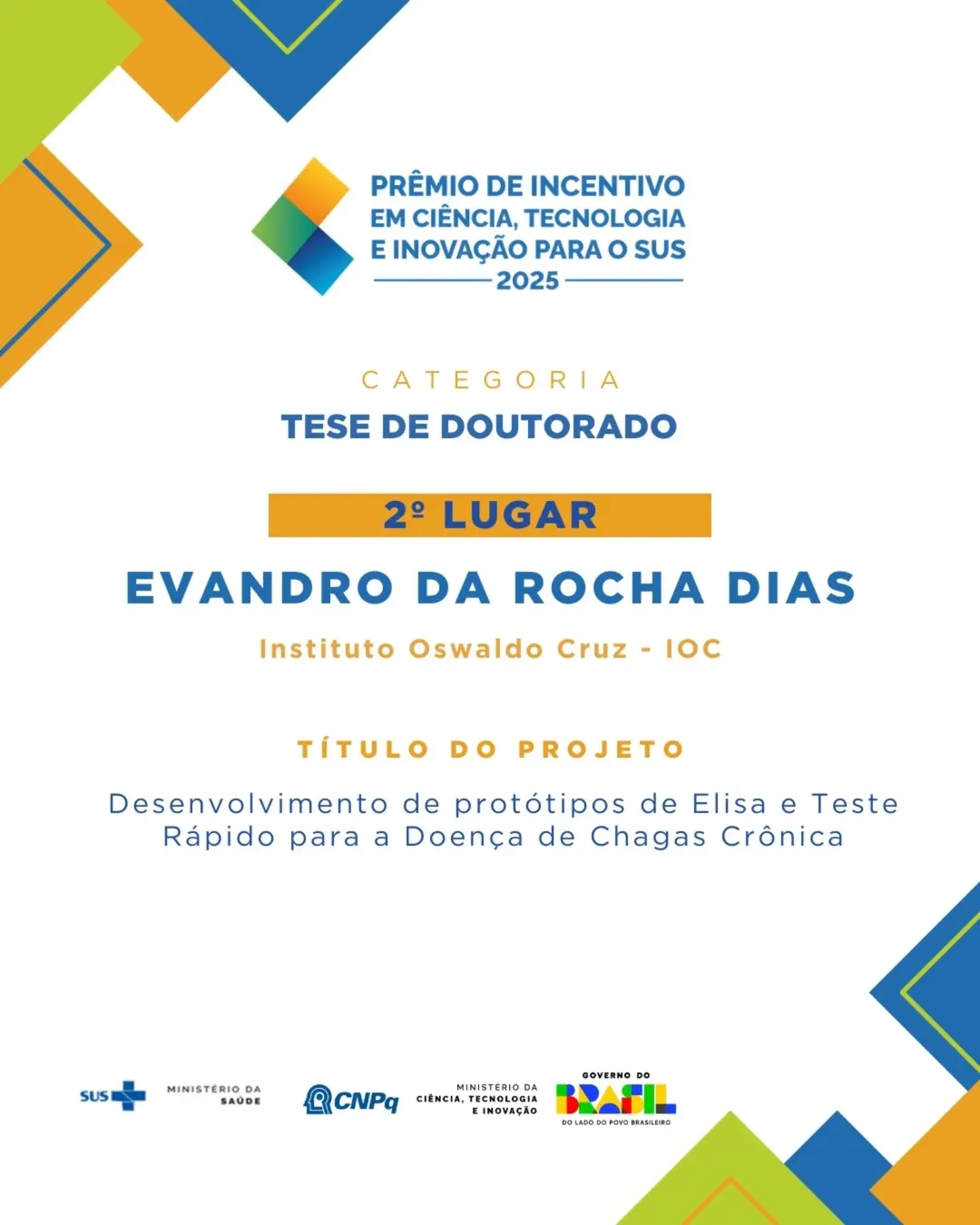 Evandro da Rocha Dias - Instituto Oswaldo Cruz (IOC) - Desenvolvimento de protótipos de Elisa e Teste Rápido para a Doença de Chagas Crônica.