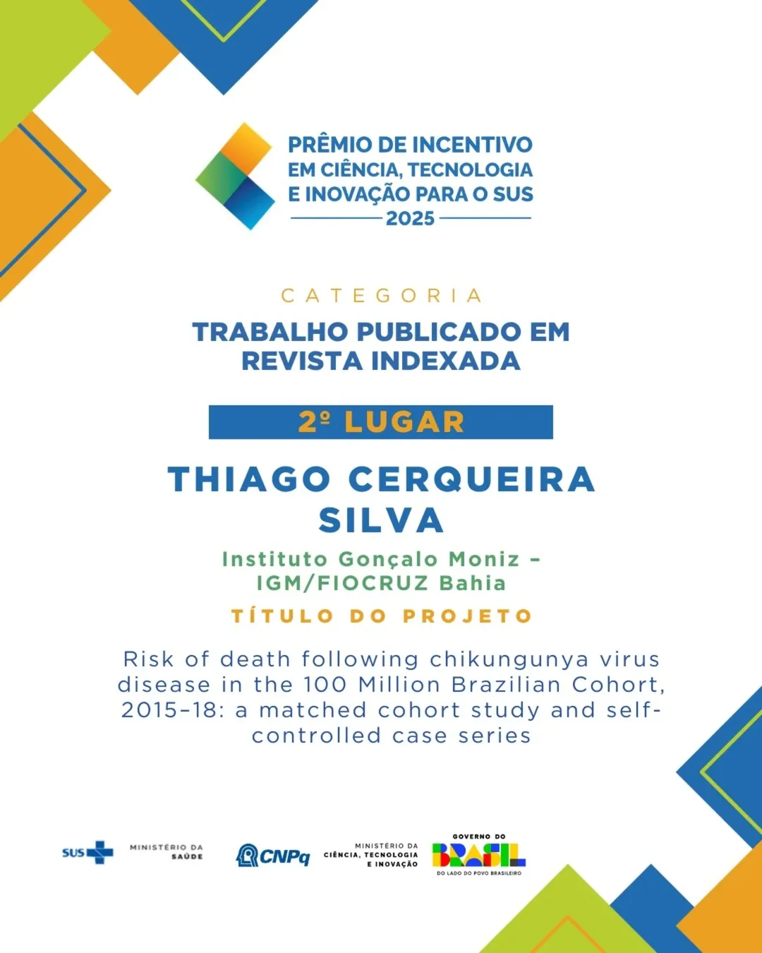 Thiago Cerqueira Silva - Instituto Gonçalo Moniz (IGM/Fiocruz Bahia) - Risk of death following chikungunya virus disease in the 100 Million Brazilian Cohort, 2015–18: a matched cohort study and self-controlled case series.