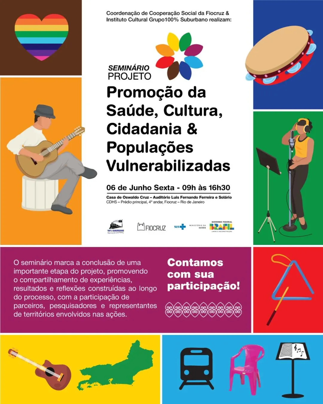 Nesta sexta feira, 6 de junho, a Cooperação Social da Presidência da Fiocruz, em parceria com o Instituto Cultural 100% Suburbano e a Casa de Oswaldo Cruz (COC/Fiocruz), vai realizar o seminário do projeto Promoção da Saúde, Cultura, Cidadania e Populações Vulnerabilizadas. O evento acontece no Salão de Conferência Luiz Fernando Ferreira e no Solário, localizados no Centro de Documentação e História da Saúde (CDHS), das 9h às 16h30. A programação conta com rodas de conversa, apresentação de produções audiovisuais do projeto, de músicas compostas por alunos da Escola de Música de Manguinhos e os pré-lançamentos do livro “Conexões: Leopoldina Choro e Samba” e do catálogo “Mapa afetivo da Leopoldina”.
